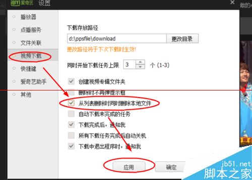 3、在【設置】界面下,點擊選擇【視頻下載】--勾選【從列表刪除時同時刪除本地文件】--【應用】選項完成設置。(如圖所示)