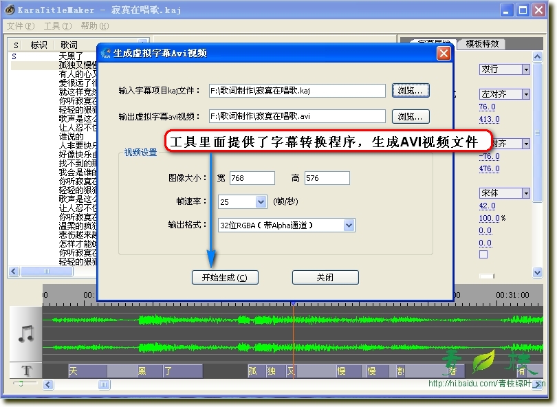 2.kaj字幕項目文件可以直接在Ulead VideoStudio(會聲會影)中使用。kaj文件本身帶有Alpha通道,將kaj文件當作視頻文件打開并直接拖入時間線視窗的覆蓋層軌道上,并且將圖像拉大至滿屏。然后將相應的音樂文件拖入音樂軌道并與kaj字幕文件對齊即可。