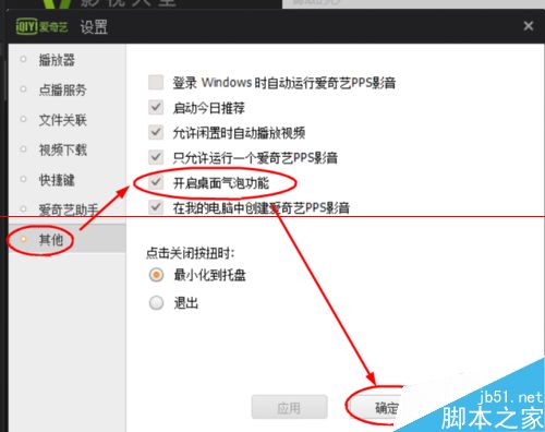 3、在【設置】界面下,點擊選擇【其他】--勾選【開啟桌面氣泡功能】--【確定】選項完成設置。(如圖所示)