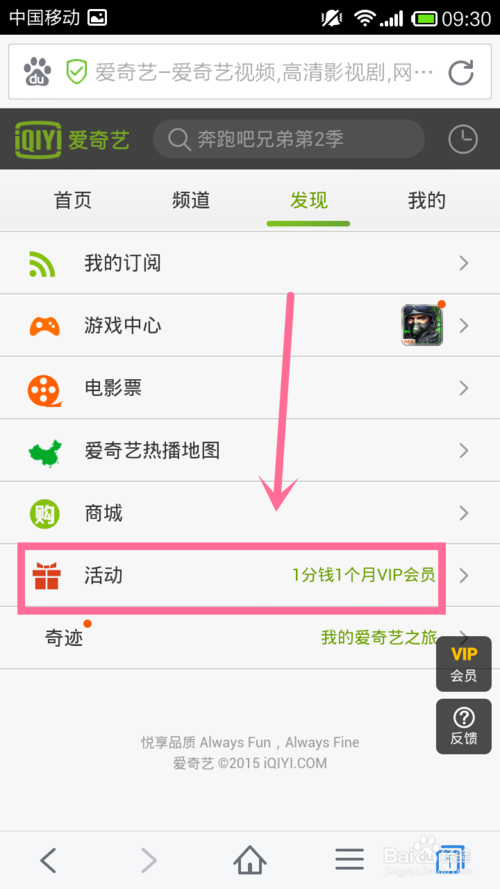 2、進入手機百度瀏覽器主頁-點擊愛奇藝窗口-再點擊發現-點擊下面的活動,這時你就能發現愛奇藝的會員贈送了(我這幅圖的這期活動是要花一分的,有時候是不用的)