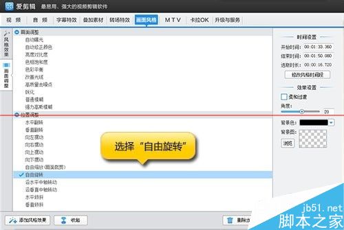 很多人用手機或攝像機拍攝的視頻畫面經常是倒放的,使用愛剪輯調整也是很簡單的。我們只需點擊“畫面風格”左欄的“畫面調整”,選擇“自由旋轉”,然后在“角度”一欄,根據視頻的畫面情況,向左或向右拉動滑桿,或直接輸入旋轉的角度值,并為視頻一鍵應用該效果,讓視頻恢復正常畫面即可。