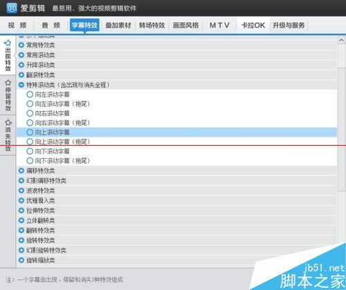 添加向上滾動的字幕效果,我們只需在“字幕特效”界面,雙擊右側視頻預覽畫面添加字幕。然后點擊左欄的“向上滾動字幕”特效,一鍵應用即可,非常方便。軟件還自帶了眾多的影院級好萊塢字幕特效供大家一鍵設置,有需要的小伙伴們都可以試試哦~