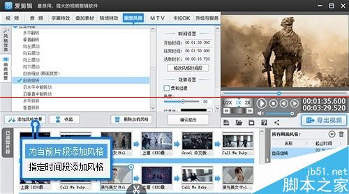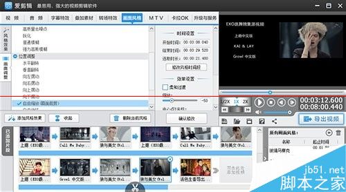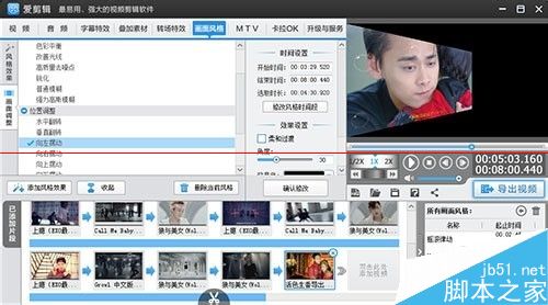 如果你的視頻畫面正常,但你想做成和網上流行的視頻節目一樣的片尾效果,那你只需在“畫面調整”一欄選擇“向左擺動”、“向右擺動”或“向上擺動”等,你可以根據自己的喜好進行選擇,不過建議大家選擇“向左擺動”效果,與接下來添加的滾動字幕更搭~