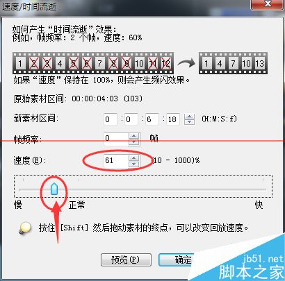 6、這“速度/時間流逝...”這個界面,拖動滑塊,往左邊拖表示動作越來越慢,往右邊拖表示動作越來越快。我們制作慢鏡頭,所以往左邊拖動