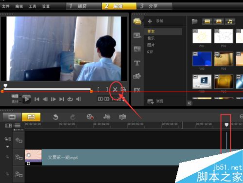 3、按紅色圈中的剪刀,剪切素材。剪切出慢鏡頭的開始部分。