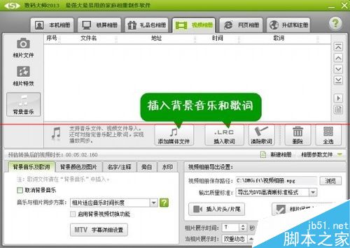制作聲色并茂的視頻相冊,離不開動聽的背景音樂。 點擊“添加媒體文件”按鈕,導入音樂或MV視頻。點擊“插入歌詞”按鈕,導入相匹配的LRC歌詞文件,制作類似明星MV視頻的效果。