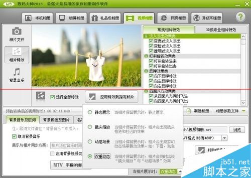 為了方便用戶,軟件智能渲染相片轉場特效。當然,如果你想自己設置酷炫特效,那也只需點擊“應用特效到指定相片”按鈕,為制作的視頻相冊一鍵設置。在“當相片展示時”的彈出框中,選擇“動感場景”或“雙重動態”特效,還可以為視頻相冊添加花瓣紛紛、蒲公英、浪漫雨天、夏日螢火蟲等如夢如幻的唯美場景特效,制作浪漫的視頻相冊。