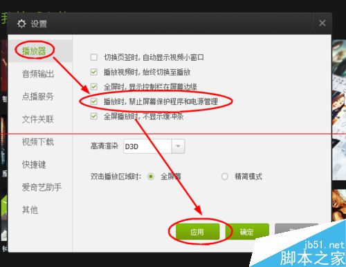 3、在【設置】界面下,點擊選擇【播放器】--勾選【播放時,禁止屏幕保護程序和電源管理】--【應用】選項完成設置。(如圖所示)