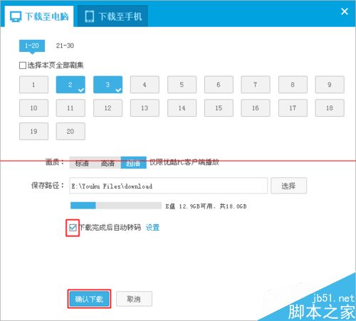 4、接著返回到上一層,將“ 下載完成后自動轉碼 打√ ”再點擊“確認下載”即可,接下來耐心等待下載完畢即可。