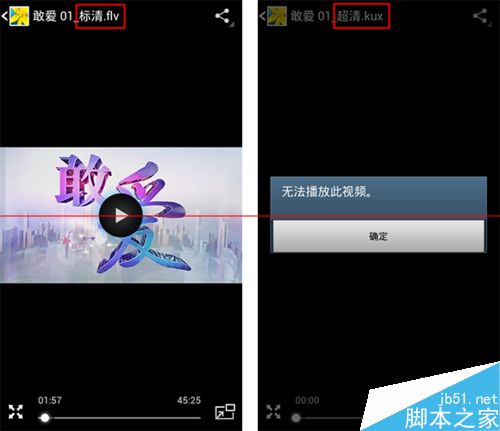 2、如下圖所示:小Y給大家演示,同樣在優酷下載的一部片,放到手機上,標清flv和高清mp4在任意播放器,都可正常播放。而超清kux格式,無論是用優酷手機版,還是其他播放器,均無法播放此視頻。