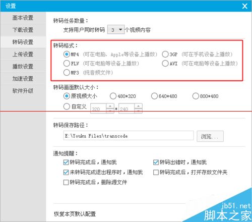 3、彈出設置窗口之后,在轉碼設置這里,可以看到轉碼格式有多種,一般情況下,我們是放到手機上播放的話,可以選擇為MP4或3GP ,然后點擊“保存”即可。