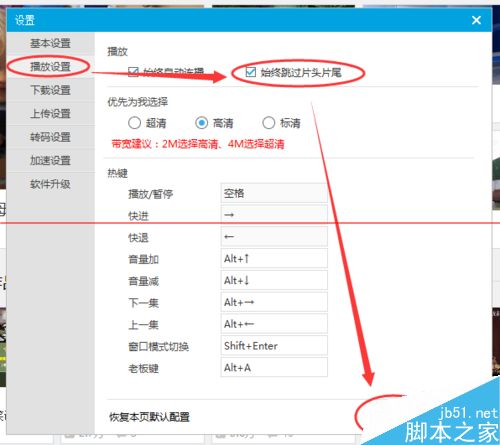 3、在【設置】界面下,點擊選擇【播放設置】--勾選【始終跳過片頭片尾】--【保存】選項完成設置。(如圖所示)