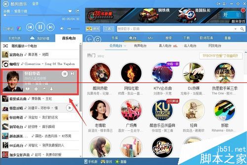 2、我們隨意選擇一個電臺收聽,正在播放的電臺變成了下圖框選的樣子。