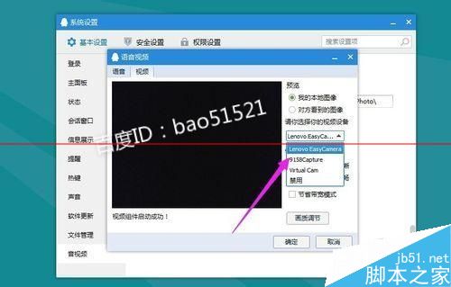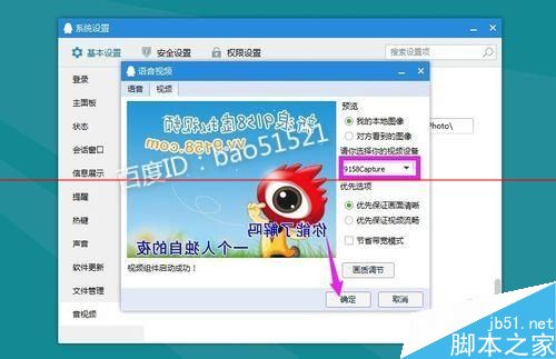 3、在彈出de對話框中把視頻設備改成虛擬視頻,然后點擊確定按鈕就可以了,這個操作de原理是把視頻de顯示指向虛擬視頻,這樣qq中de視頻就托管給了虛擬視頻軟件。