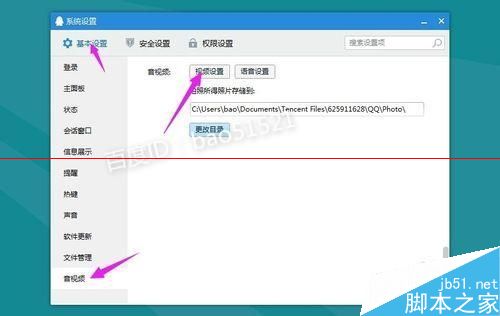 2、打開qqde系統(tǒng)設置,在基本設置里選擇音視頻,然后點擊視頻設置按鈕,這樣就會打開qqde視頻設置面板。
