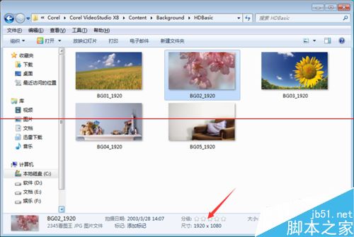 6、打開HDBasic文件夾后,就會看到一些圖片,當你把鼠標放在圖片上,你就會看到它的圖片大小是1920*1080