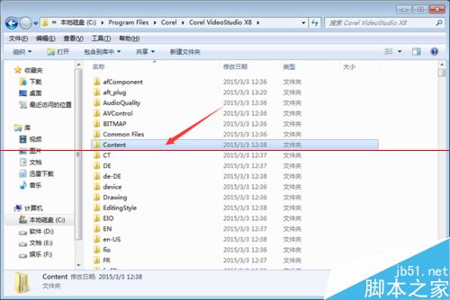 3、點擊打開文件位置后,就到了會聲會影x8的安裝目錄文件中。這時我們把鼠標向上移動,找到Content文件夾。雙擊打開Content文件夾。
