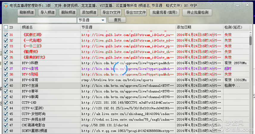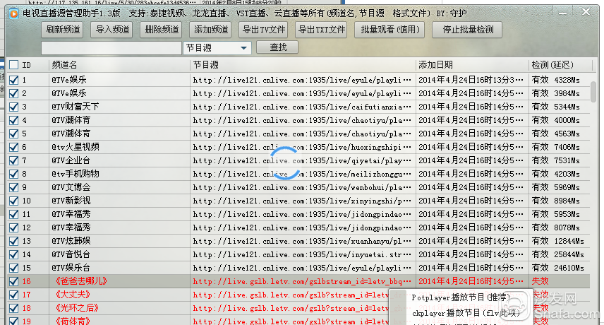 4、單擊確認正確,立即導入。然后點軟件界面頂部最后的“批量檢測直播源”,就ok了。程序會自動檢測出所有的有效源和無效源。
