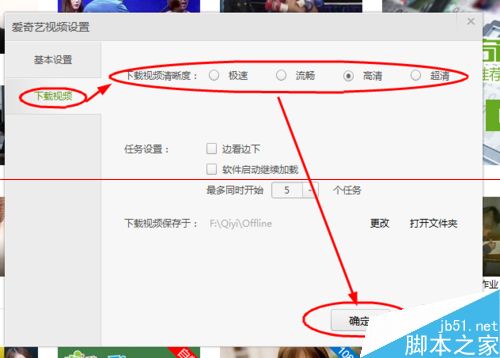 3、在【設(shè)置】界面下,點(diǎn)擊選擇【下載設(shè)置】-->【下載視頻清晰度】選擇想要設(shè)定的清晰度-->【確定】選項(xiàng)完成操作。(如圖所示)