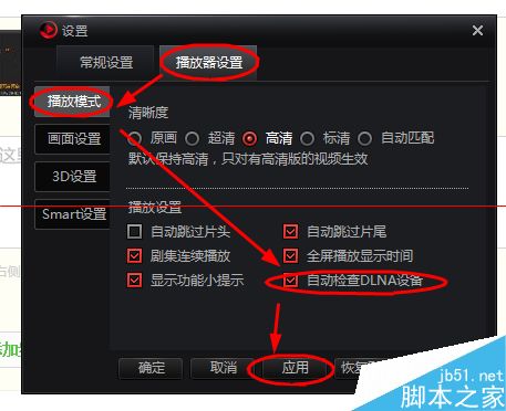 3、在【設置】界面下,點擊選擇【播放器設置】-->【播放模式】-->勾選【自動檢查DLNA設置】-->【應用】選項完成操作。(如圖所示)