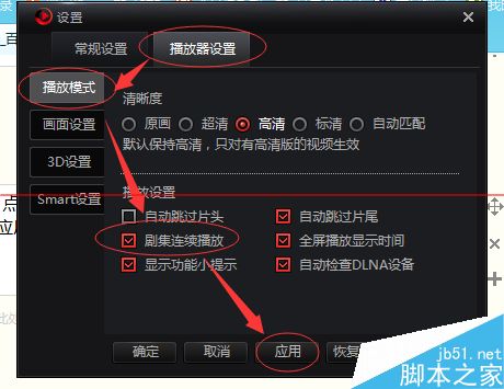 3、在【設置】界面下,點擊選擇【播放器設置】-->【播放模式】-->勾選【顯示功能小提示】-->【應用】選項完成操作。(如圖所示)