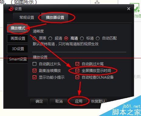 3、在【設(shè)置】界面下,點擊選擇【播放器設(shè)置】-->【播放模式】-->勾選【全屏播放顯示時間】-->【應(yīng)用】選項完成操作。(如圖所示)
