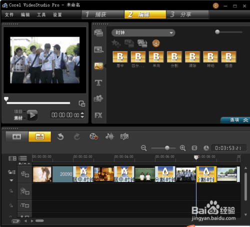 2、點擊轉場按鈕---收藏夾---時鐘,然后選擇第一個時鐘效果