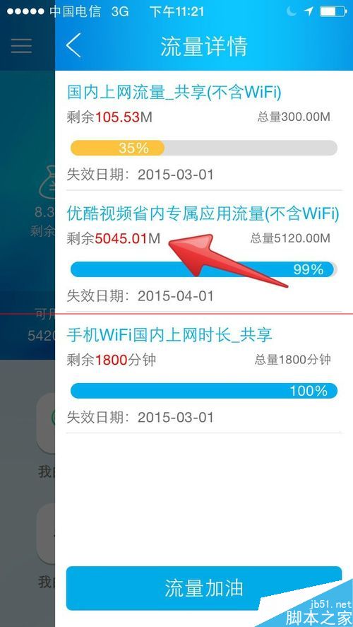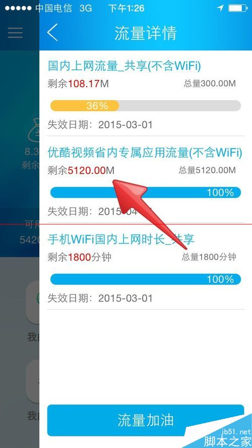 4、優酷視頻播放完了之后,點擊流量客戶端進行查看,可以看到,剛剛用的流量,只是扣的你的優酷視頻省內專屬應用流量,你的國內上網流量不變。此時完成優酷視頻省內專屬應用流量的使用及查看。