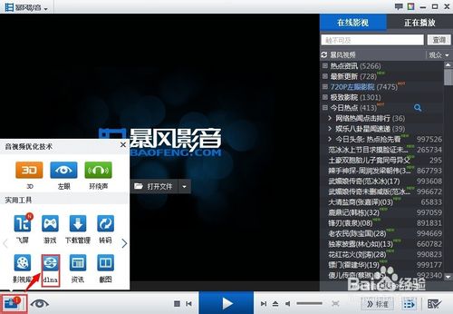 2、打開剛剛安裝的“暴風影音”,單機右下角的“工具箱”圖標,然后單機里面的“dlna”。(這一步之前就可以打開電視,并且開啟電視的DLNA功能了)。