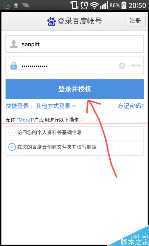 4、界面跳到百度賬號(hào)授權(quán)界面,輸入你的百度ID與密碼。點(diǎn)擊登錄并授權(quán)。