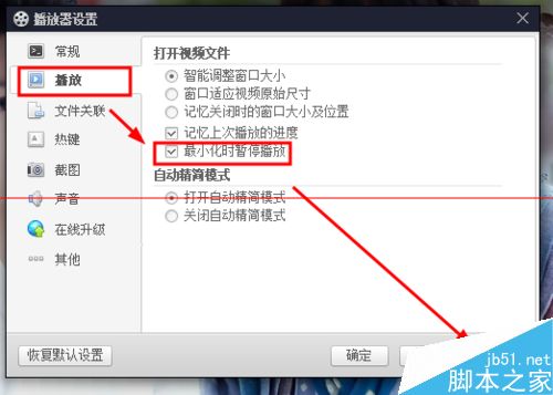 3、在【播放器設置】界面下,點擊選擇【播放】-->勾選【最小化時暫停播放】-->【應用】選項完成操作。(如圖所示)