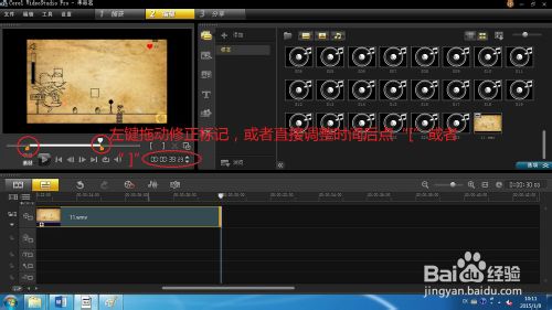 修剪媒體文件長度,如圖所示,會聲會影有三種方式修剪媒體文件長度,既可以左右拖動修正標(biāo)記;也可以更改“時間碼”,更改時間碼后需要點擊‘[’(開始標(biāo)記)或者‘]’(結(jié)束標(biāo)記)進行修剪;還可以直接在軌道中點擊需要修改的媒體文件,并在其收尾處直接拖動。