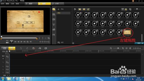 如圖所示,“左鍵”拖拽媒體文件到第一個“視頻軌”中。