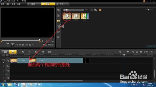 將轉(zhuǎn)場效果拖動到兩個媒體文件之間。