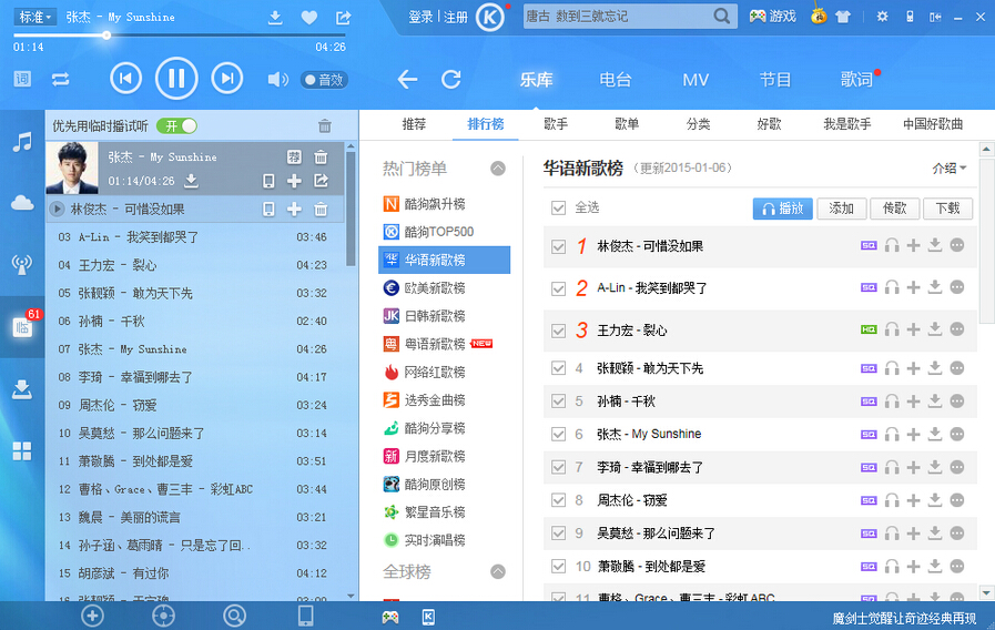 酷狗音樂最新版新增了臨時播功能,優先用臨時播試聽功能開啟后在播放歌曲時就可以隨意挑歌無痕試聽并切換播放列表,非常方便。下面教大家使用方法。