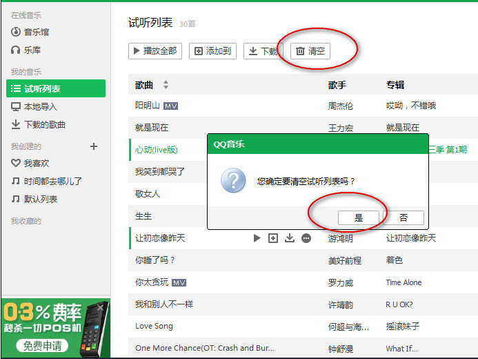2、我們可以看到試聽列表中有一個"清空"按鈕,點擊一下就可以清空了。在彈出的對話框中選擇“是”