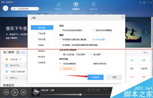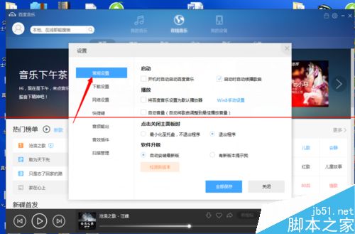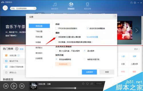 4、在”常規設置“項目下,有一個”播放“項,其中第一個就是”將百度音樂設置為默認播放器“,現在前面的方框內是空白的。在方框內打上勾。