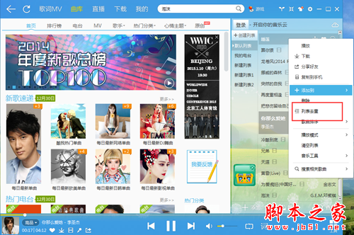 2、接著,切換到你的音樂列表中,右擊列表,選擇“列表去重”這樣列表中重復的歌曲就不存在了。