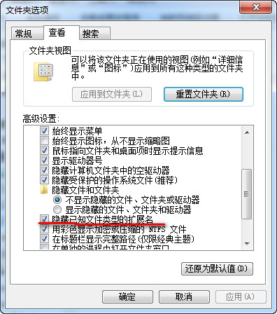 2、在“文件夾選項”對話框中選擇“查看”選項卡去掉“隱藏已知文件擴展名”的勾勾