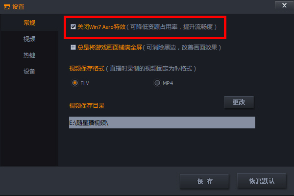 2、在隨星播的 設置 - 常規 中勾選“關閉Win7 Aero效果”