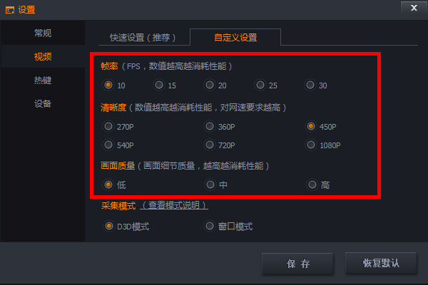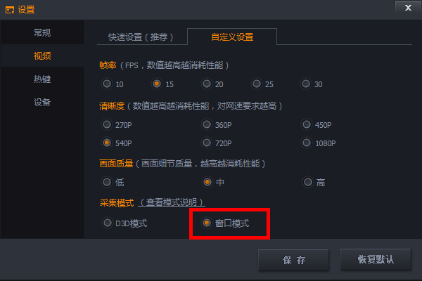 1、在隨星播的 設置 - 視頻 - 自定義 中將采集模式選擇為“窗口模式”