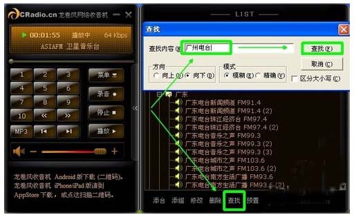 一、在版面底部點擊“查找”然后輸入“關(guān)鍵詞”來查找其他的臺電或歌曲名,因為列表實在是太多臺電和類目了,一個個翻看也費時間。