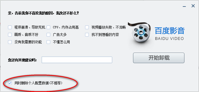 方法四:把你現(xiàn)有的百度影音。使用卸載軟件,卸載干凈。【記得刪除配置文件】。 然后手動(dòng)重啟電腦。再次安裝這個(gè)版本。記得路徑不要有中文。路徑最好是。D:/baidu/baiduplayer 不要是 D:/百度影音/baiduplayer