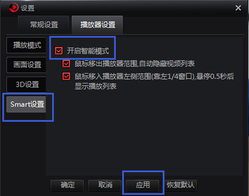 3、可以選擇是否開啟智能模式,鼠標移出播放器范圍,是否自動隱藏視頻列表,鼠標移入播放器左側范圍(靠左1/4窗口),懸停0.5秒后是否顯示播放列表,設置之后,點擊“應用”或者“確定”按鈕保存,點擊“恢復默認”按鈕則可恢復到默認設置。