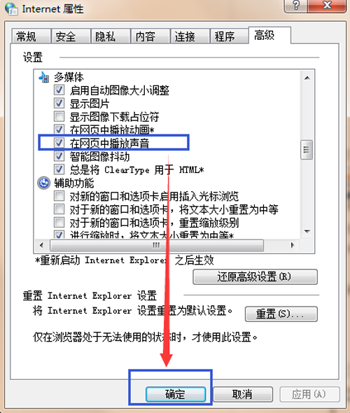 2、查看 Internet 選項 -> 高級 -> 多媒體 -> 播放網頁中的聲音是否勾選,如下圖所示: