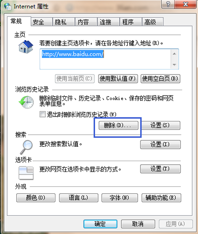 3、點(diǎn)擊“瀏覽歷史記錄—刪除” 按鈕。如圖: