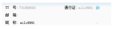 點擊圓頭像,會出現個人資料面板,在個人資料中,有“YY號”、“通行證”、“郵箱”、“昵稱”等信息: