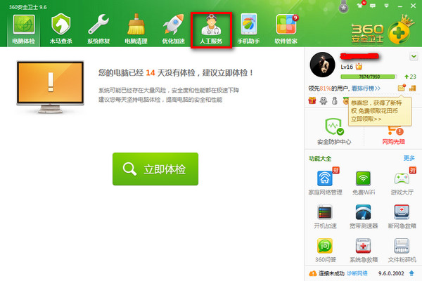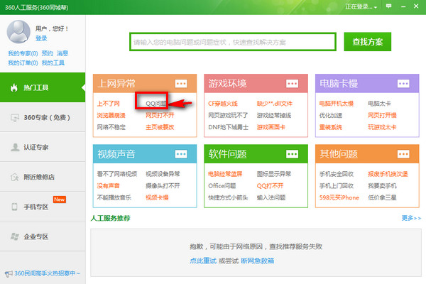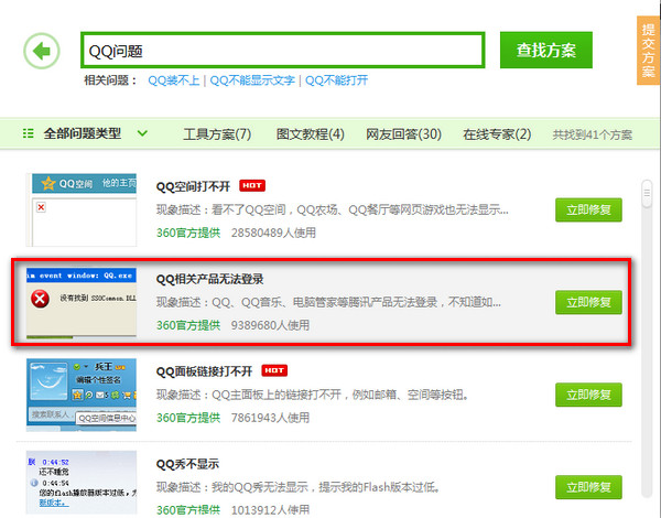 3、利用360等安全衛(wèi)士進(jìn)行問題修復(fù),打開安全衛(wèi)士界面,點(diǎn)擊菜單欄上的人工服務(wù)、找到QQ問題、找到qq相關(guān)產(chǎn)品無法登陸選項(xiàng),點(diǎn)擊立即修復(fù)。修復(fù)完成后,重新打開QQ音樂,應(yīng)該就可以了