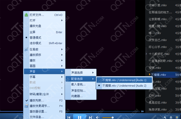 4、使用QQ影音或暴風影音播放,播放的時候是原聲,請右鍵->聲音->配音選擇->選擇另一個。