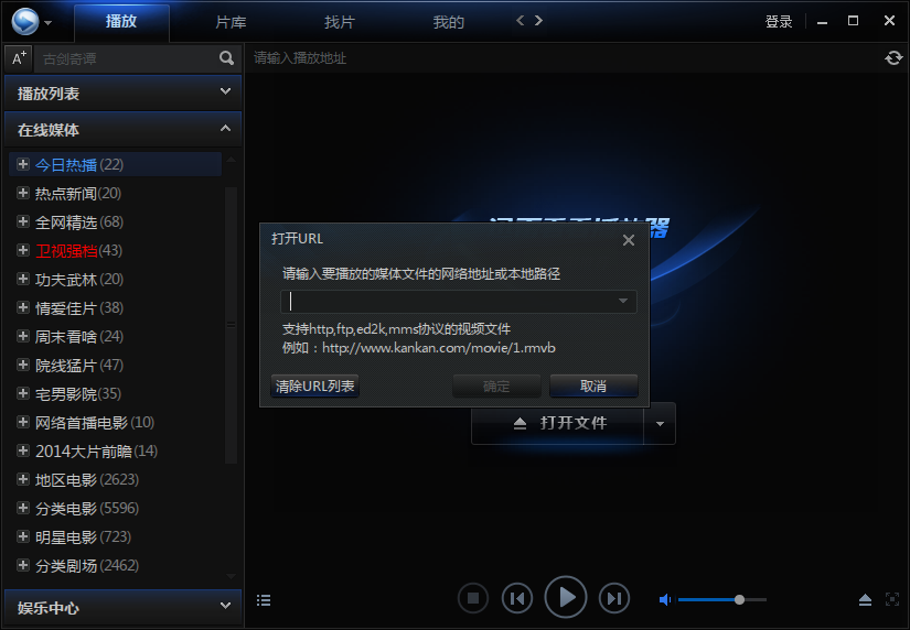 4、選擇打開URL,提示,輸入要播放的媒體文件的網(wǎng)絡地址或本地路徑